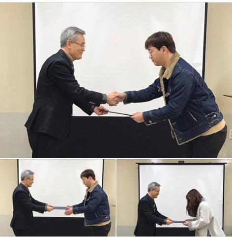 전체 직원분들이 참석하여 임명장 수여식을 진행하고 관장님과 수줍은 미소로 악수도 나누었답니다.