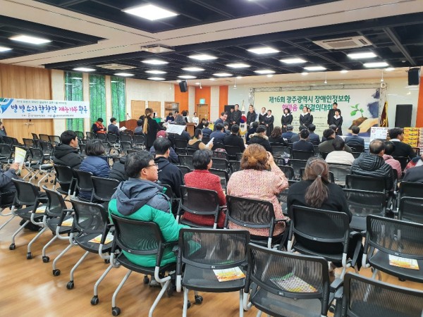 광주평생교육진흥원 2019년 하반기 장애인 평생학습 지원사업 “별 빛 소리 합창단”이 제16회 장애인정보화 한마음 촉진 결의대회 축하 식전공연에 올라갔습니다. 합창 단원들은 처음 외부에서 하는 공연 이였지만 떨지 않고 평상시 연습 한데로 멋진 모습을 보여주었습니다. 이번 공연으로 지역주민들에게 광주광역시동구장애인복지관 합창단을 알리는 계기와 재능기부를 통해 만족감과 뿌듯함을 느꼈습니다. 사업을 지원해주신 광주평생교육진흥원과 사회환원활동의 기회를 주신 광주광역시장애인정보화협회 관계자분들에게 감사드립니다.