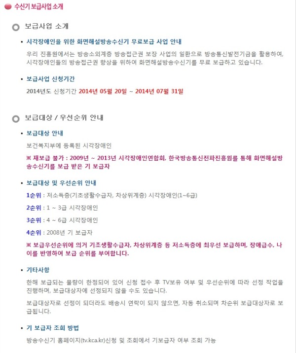 복지정보 2014년 시각장애인 화면해설방송수신기 무료보급사업 안내