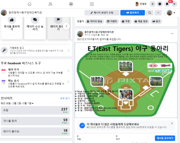 2021년 E.T야구동아리 참여자를 모집합니다. 게시글 작성정보 작성자 문화지원팀 작성일 21-03-03 11:06 조회수 1,779 댓글수 0 목록 게시글 본문 첨부파일 2개 페이스북홍보사진.png (348.3K) 1회 다운로드 첨부일시 : 2021-03-03 11:06:00 야구홍보 시안.png (618.7K) 1회 다운로드 첨부일시 : 2021-03-03 11:06:00 이전글 청소년발달장애인 방과후 활동서비스 대상자 모집 21-03-09 다음글 나눔으로 풍성해진 설명절 행복나눔 21-02-09 댓글 0 등록된 댓글이 없습니다. 목록