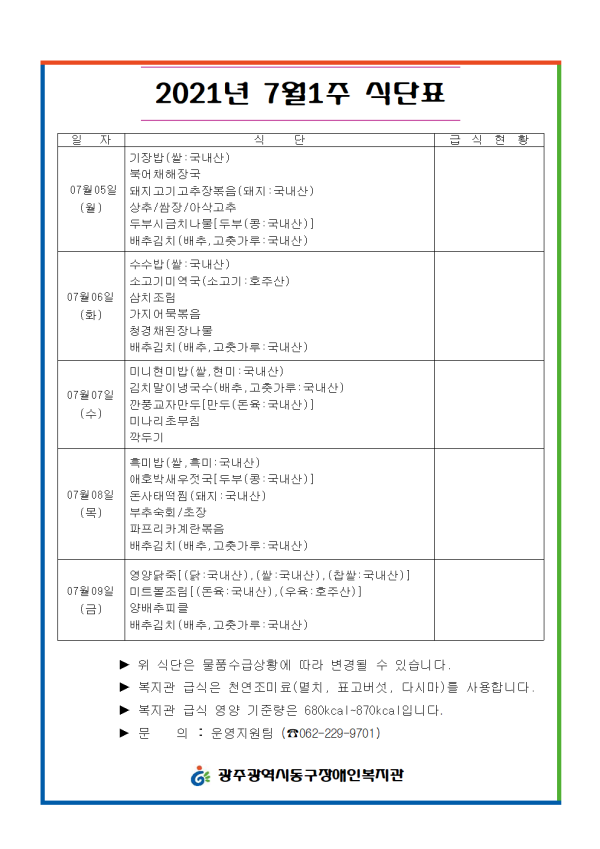 2021년 7월 1주 식단표 게시글 작성정보 작성자 류현진 작성일 21-07-05 08:12 조회수 1,642 댓글수 0 목록 게시글 본문 첨부파일 2개 7.5~7001.png (38.5K) 3회 다운로드 첨부일시 : 2021-07-05 08:12:00 7.5~7001.png (330.5K) 3회 다운로드 첨부일시 : 2021-07-05 08:12:00 이전글 2021년 7월2주 식단표 21-07-12 다음글 2021년 1차 테마여행 잘 다녀왔습니다. 21-06-28 댓글 0 등록된 댓글이 없습니다. 목록