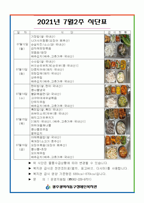 2021년 7월2주 식단표 게시글 작성정보 작성자 류현진 작성일 21-07-12 07:42 조회수 1,630 댓글수 0 목록 게시글 본문 첨부파일 2개 7.12~7001.png (39.7K) 3회 다운로드 첨부일시 : 2021-07-12 07:42:00 7.12~7001.gif (168.3K) 3회 다운로드 첨부일시 : 2021-07-12 07:42:00 이전글 2021년 7월3주 식단표 21-07-16 다음글 2021년 7월 1주 식단표 21-07-05 댓글 0 등록된 댓글이 없습니다. 목록