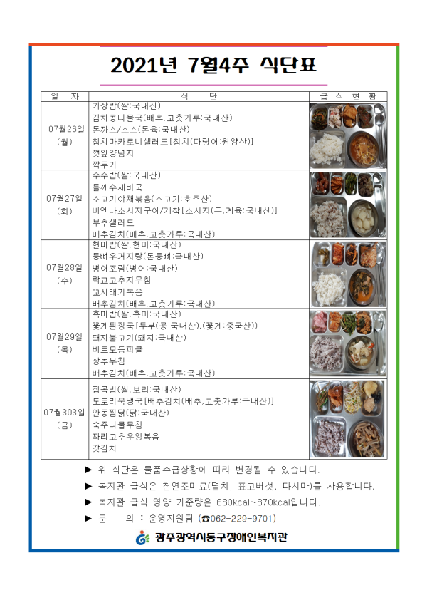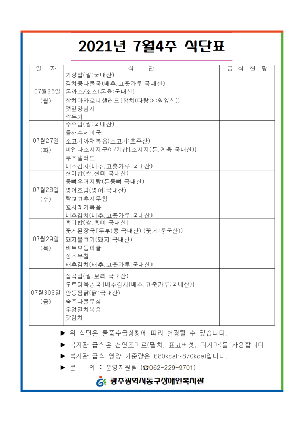 2021년 7월4주 식단표 게시글 작성정보 작성자 류현진 작성일 21-07-26 08:00 조회수 1,603 댓글수 0 목록 게시글 본문 첨부파일 3개 7.26.~7001.png (39.6K) 4회 다운로드 첨부일시 : 2021-07-26 08:00:00 7.26.~7001.png (39.9K) 4회 다운로드 첨부일시 : 2021-07-26 08:00:00 7.26.~7001.png (344.1K) 4회 다운로드 첨부일시 : 2021-07-26 08:00:00 이전글 우쿨렐레 참여자모집 21-07-26 다음글 장애인에 대한 사회인식 개선 영상 공모전 안내 21-07-22 댓글 0 등록된 댓글이 없습니다. 목록