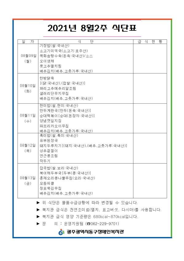 2021년 8월2주 식단표 게시글 작성정보 작성자 류현진 작성일 21-08-06 13:58 조회수 1,659 댓글수 0 목록 게시글 본문 첨부파일 3개 8.9.~8001.png (38.9K) 5회 다운로드 첨부일시 : 2021-08-06 13:58:00 8.9.~8001.png (38.9K) 5회 다운로드 첨부일시 : 2021-08-06 13:58:00 8.9.~8001.png (349.4K) 5회 다운로드 첨부일시 : 2021-08-06 13:58:00 이전글 생활인문학수강생 모집 21-08-11 다음글 "말복 기념 이벤트!" 참여 하세요 21-08-05 댓글 0 등록된 댓글이 없습니다. 목록