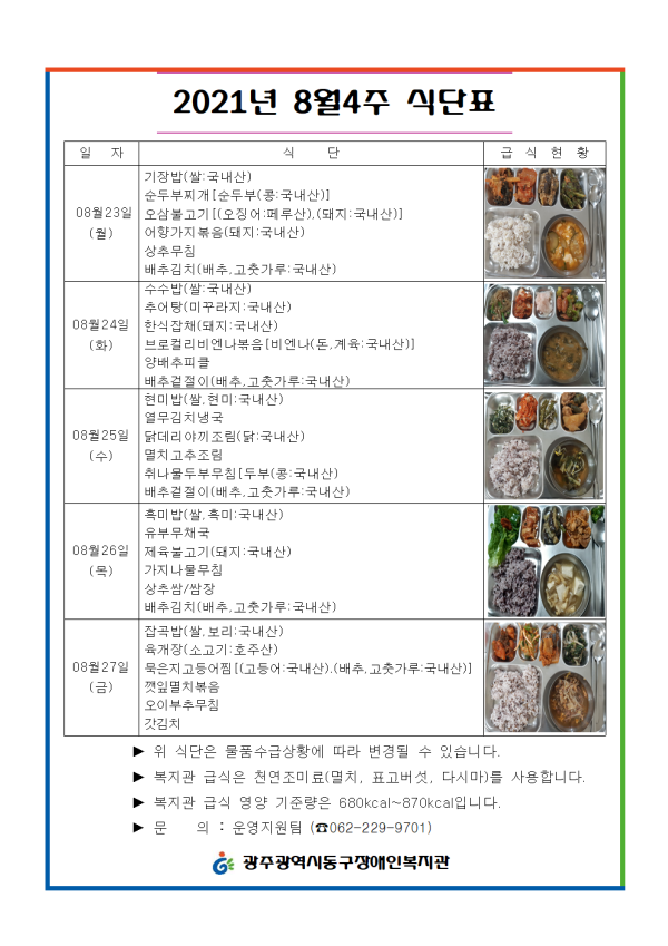 2021년 8월4주 식단표 게시글 작성정보 작성자 류현진 작성일 21-08-20 17:13 조회수 1,704 댓글수 0 목록 게시글 본문 첨부파일 3개 8.23.~8001.png (40.4K) 5회 다운로드 첨부일시 : 2021-08-20 17:13:00 8.23.~8001.png (357.0K) 5회 다운로드 첨부일시 : 2021-08-20 17:13:00 8.23.~8001.png (357.0K) 5회 다운로드 첨부일시 : 2021-08-20 17:13:00 이전글 2021년 9월1주 식단표 21-08-27 다음글 2021년 8월3주 식단표 21-08-13 댓글 0 등록된 댓글이 없습니다. 목록