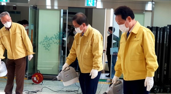 <사진4> 동구행복재단 이사장이신 임택 동구청장, 김병규 대표이사, 장세종 관장님이 함께 복지관을 소독하는 모습