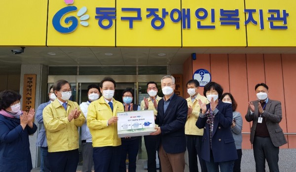 <사진1> 동구행복재단 이사장이신 임택 동구청장님께서 광주동구장애인복지관에 소독기를 전달하는 모습