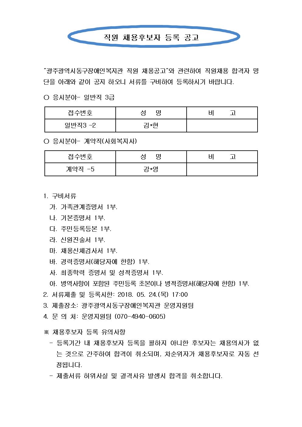 광주광역시동구장애인복지관 직원 채용공고와 관련하여 직원채용 합격자 명단을 아래와 같이 공지하오니 서류를 구비하여 등록하시기 바랍니다.