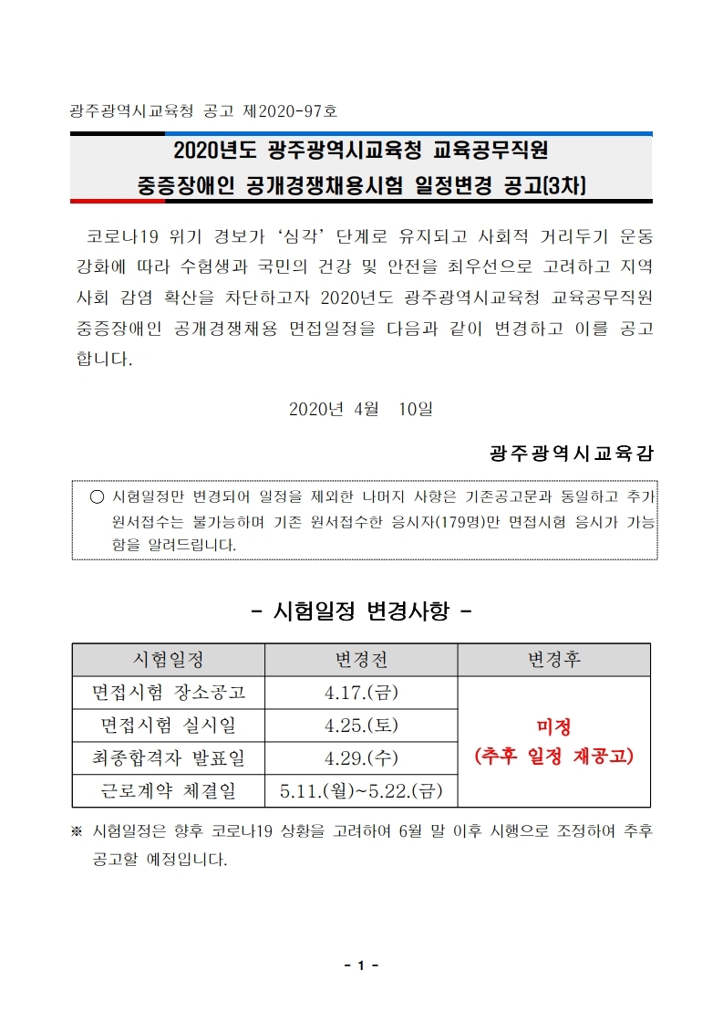 교육공무직 일정변경공고 3차_20년도 광주광역시교육청 교육공무직원 중증장애인 공개경쟁채용시험 게시글 작성정보 작성자 김병진 작성일 20-04-10 11:26 조회수 1,479 댓글수 0 목록 게시글 본문 첨부파일 1개 2020년도광주광역시교육청교육공무직원(중증장애인)공개경쟁채용시험일정변경공고문(3차).pdf_page_1.jpg (302.7K) 0회 다운로드 첨부일시 : 2020-04-10 11:26:00 이전글 초록여행과 함께 즐거운 여행을 떠나세요 20-04-13 다음글 <알림>코로나19 극복을 위한 사랑나눔 간편식 전달 20-03-31 댓글 0 등록된 댓글이 없습니다. 목록