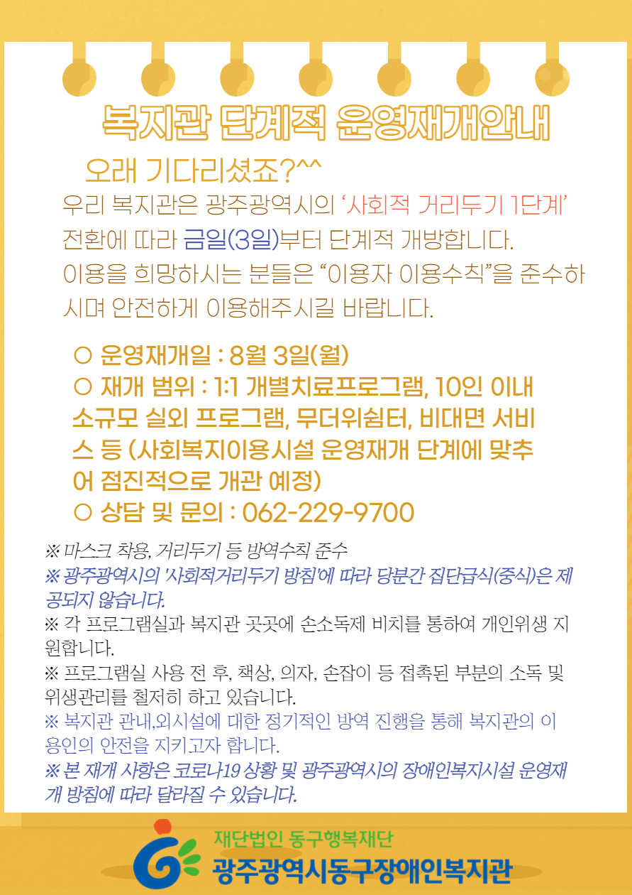 본 재개 사항은 코로나19 상황 및 광주광역시의 장애인복지시설 운영 재개 방침에 따라 달라질 수 있습니다.