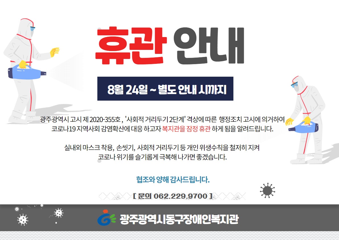 사회적 거리 2단계에 따른 복지관 휴관안내 게시글 작성정보 작성자 기획홍보팀 작성일 20-08-25 09:18 조회수 1,527 댓글수 0 목록 게시글 본문 첨부파일 1개 202008240604089811.jpg (188.4K) 1회 다운로드 첨부일시 : 2020-08-25 09:18:00 이전글 초록여행 N행시 이벤트!!!!! 20-09-01 다음글 2020년 장애인일자리사업 9월 근무상황일지 20-08-24 댓글 0 등록된 댓글이 없습니다. 목록