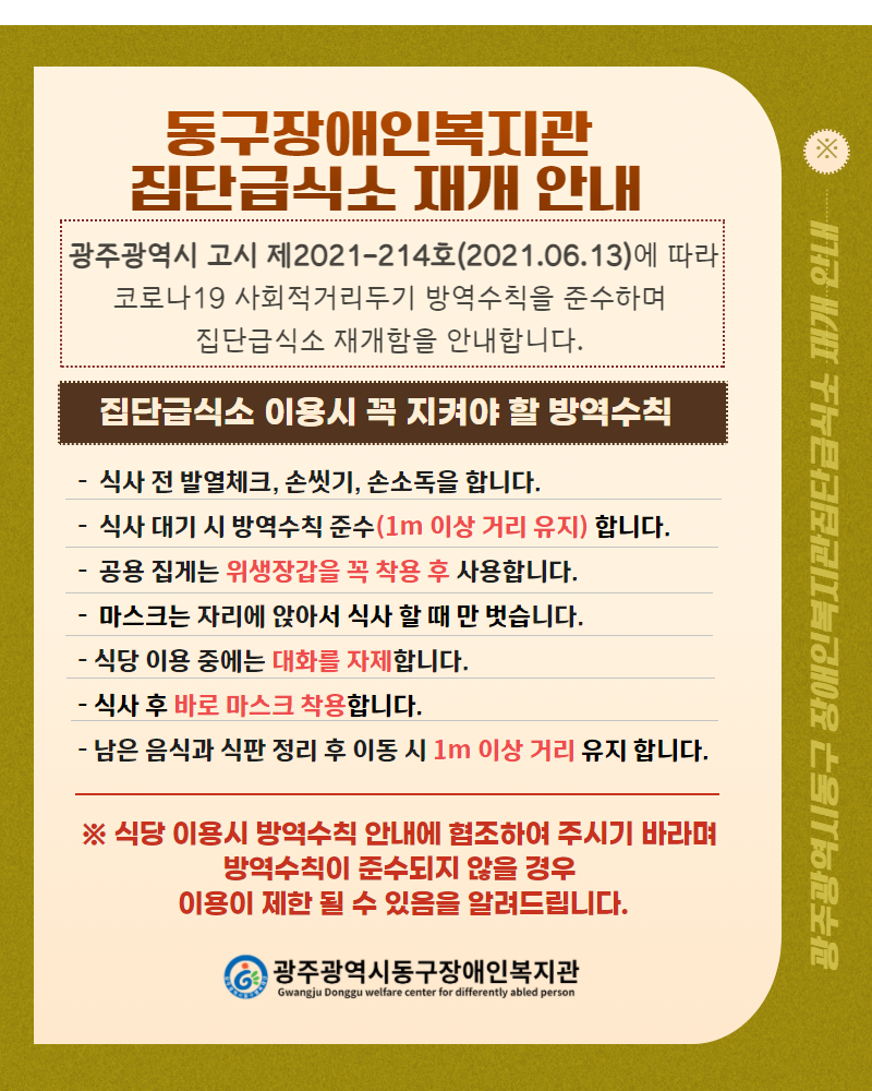 복지관 집단급식소 재개 안내 게시글 작성정보 작성자 운영지원팀 작성일 21-06-15 19:36 조회수 1,342 댓글수 0 목록 게시글 본문 첨부파일 1개 식당이용안내.png (392.2K) 7회 다운로드 첨부일시 : 2021-06-15 19:36:00 이전글 2021년 영유아기 발달장애인 1차 부모 자조모임 참가자 모집 21-06-18 다음글 직원 채용 합격자 공고 21-06-11 댓글 0 등록된 댓글이 없습니다. 목록