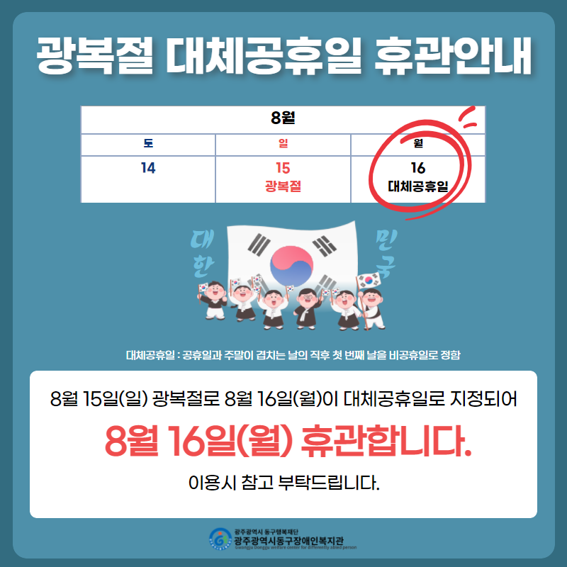 광복절 대체공휴일 휴관 안내 게시글 작성정보 작성자 기획홍보팀 작성일 21-08-13 08:58 조회수 1,218 댓글수 0 목록 게시글 본문 첨부파일 1개 광복절휴관안내 (1).png (125.7K) 7회 다운로드 첨부일시 : 2021-08-13 08:58:00 이전글 2021년 장애아가족양육지원사업 장애아돌보미 2차 채용 공고 21-08-25 다음글 성관련 개별·그룹 상담 참가자 모집 21-08-05 댓글 0 등록된 댓글이 없습니다. 목록
