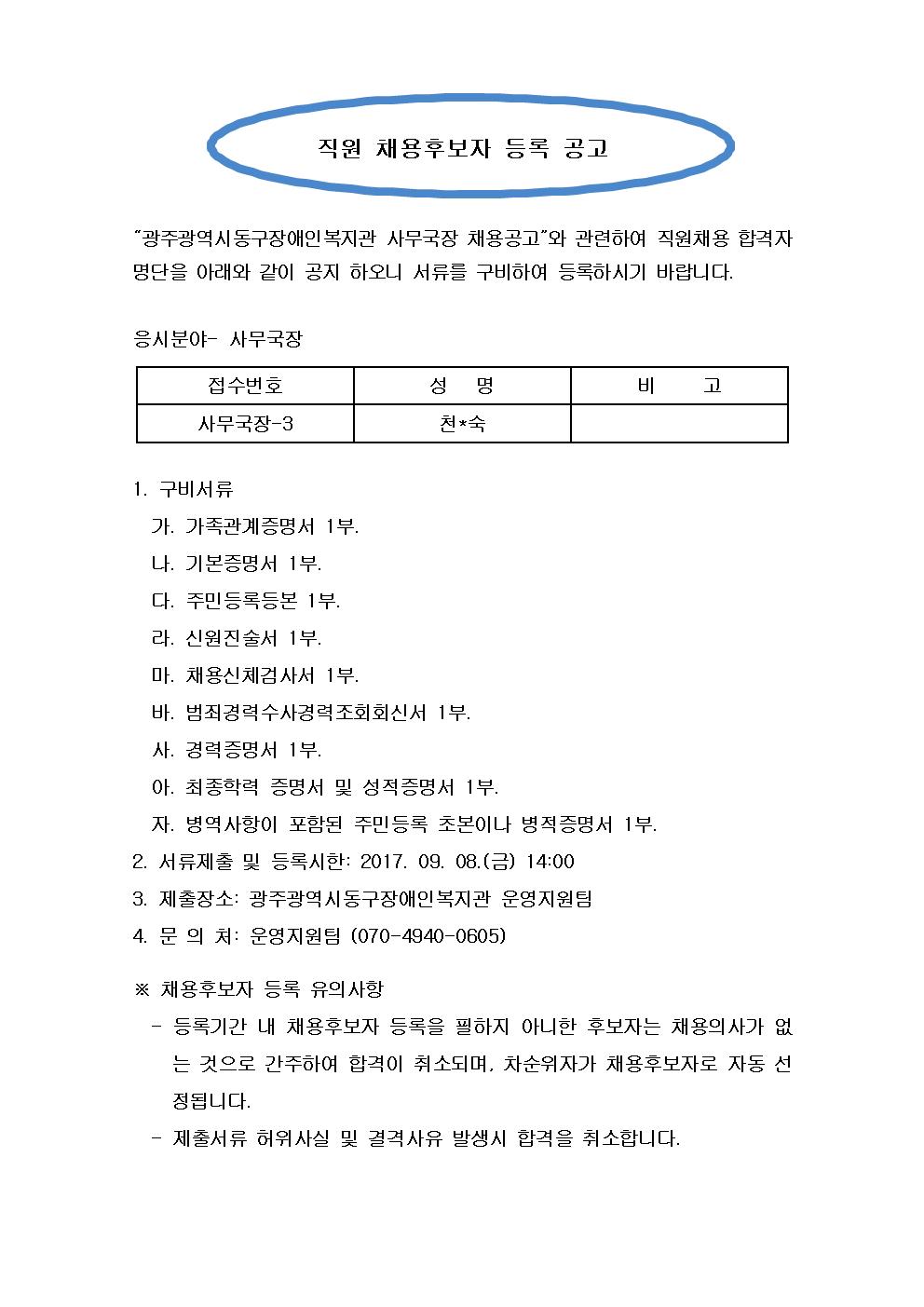 직원(사무국장) 채용예정자 공고 게시글 작성정보 작성자 김병진 작성일 17-09-06 12:04 조회수 2,762 댓글수 0 목록 게시글 본문 첨부파일 1개 합격자공고-2017.09.06001.jpg (124.5K) 0회 다운로드 첨부일시 : 2017-09-06 12:04:00 이전글 소통과 공감을 북돋는 『부모교육』 참가자 모집 17-09-07 다음글 직원 채용 서류전형 합격자 및 면접 일정 공지 17-09-04 댓글 0 등록된 댓글이 없습니다. 목록