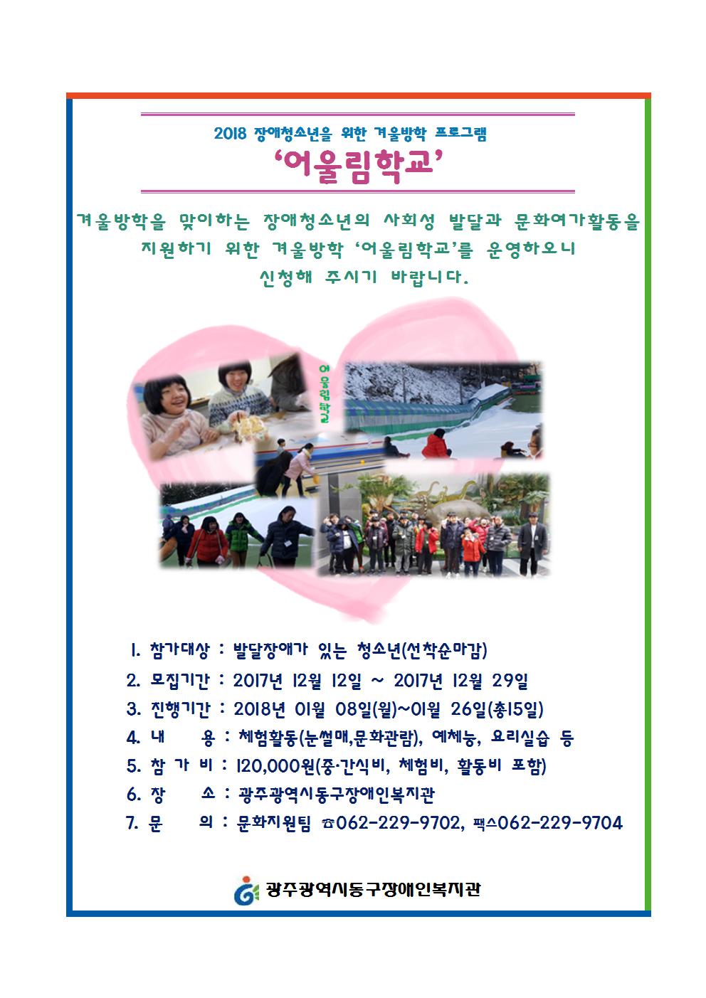 겨울방학을 맞이하는 장애청소년의 사회성 발달과 문화여가활동 지원을 위한 겨울방학 '어울림학교'를 운영하오니 신청해 주시기 바랍니다.