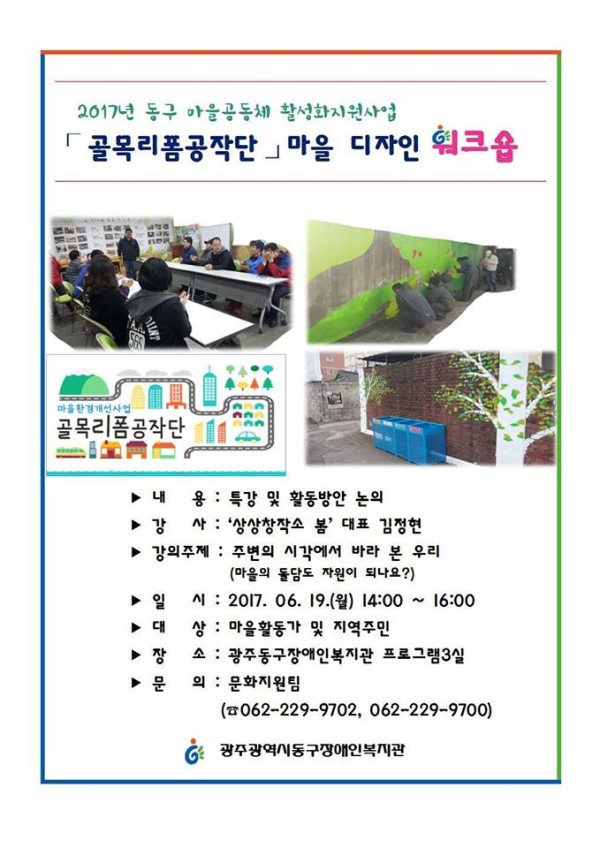 골목리폼공작단 마을 디자인 워크숍 홍보 게시글 작성정보 작성자 김보미 작성일 17-06-16 09:14 조회수 733 댓글수 0 목록 게시글 본문 #광주광역시 동구가 후원하는 '#동구 #마을공동체 지원사업'인 <골목리폼공작단> #워크숍 안내 첨부파일 2개 1.jpg (77.0K) 0회 다운로드 첨부일시 : 2017-06-16 09:14:00 1.jpg (77.0K) 0회 다운로드 첨부일시 : 2017-06-16 09:14:00 이전글 남해바다장어 가족외식 진행 17-06-19 다음글 행복나눔 가게 참뫼에서 가족외식 진행 17-06-16 댓글 0 등록된 댓글이 없습니다. 목록