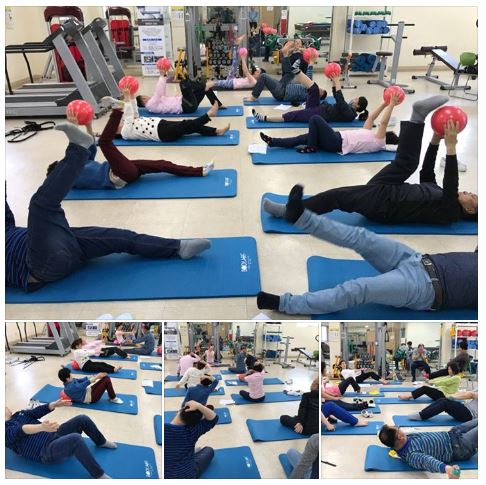 필라테스 운동은 크게 기구를 사용하는 기구 필라테스와 매트위에서 간단한 소도구를 사용하는 매트 필라테스로 구분 하는데 매트 필라테스로 짐볼운동, 밴드, 폼롤러, 아령 운동 등 다양한 운동으로 소근육을 강화시켜 우리 몸에 밸런스를 맞추면서 열심히 배우고 있습니다. 아름다운 몸짱이 되는 그날 까지 화이팅!!