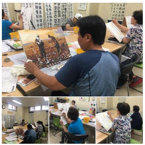 평소 미술 활동을 좋아하시는 분들이 모여서 명화그리기를 하시는데요. 미술에 관심이 크게 없더라도 우리가 전에 한번은 봤음직한 유명한 작품들이나 아름다운 풍경, 정물들을 주1회 모여서 그리는 프로그램입니다.