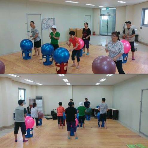 동구장애인복지관에서는 스트레스 및 우울감 해소를 위해 신나는 음악과 함께하는 짐볼 난타 운동교실을 운영합니다.