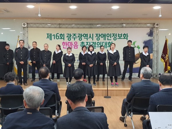 광주평생교육진흥원 2019년 하반기 장애인 평생학습 지원사업 “별 빛 소리 합창단”이 제16회 장애인정보화 한마음 촉진 결의대회 축하 식전공연에 올라갔습니다. 합창 단원들은 처음 외부에서 하는 공연 이였지만 떨지 않고 평상시 연습 한데로 멋진 모습을 보여주었습니다. 이번 공연으로 지역주민들에게 광주광역시동구장애인복지관 합창단을 알리는 계기와 재능기부를 통해 만족감과 뿌듯함을 느꼈습니다. 사업을 지원해주신 광주평생교육진흥원과 사회환원활동의 기회를 주신 광주광역시장애인정보화협회 관계자분들에게 감사드립니다.