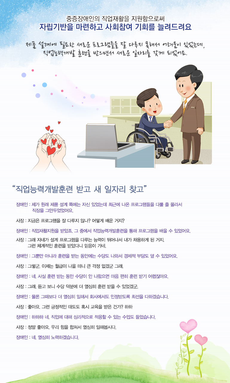 - 만 15세 이상의 장애인으로서 직업생활 및 직업환경에 대한 심리적, 기능적인 적응력의 향상과 직무능력향상이 필요한 경우