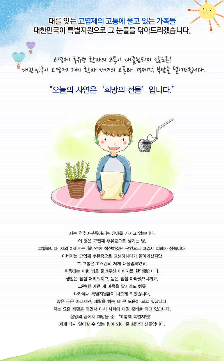 고엽제 후유증 환자의 자녀가 선천적 장애로 어려움을 겪지 않도록