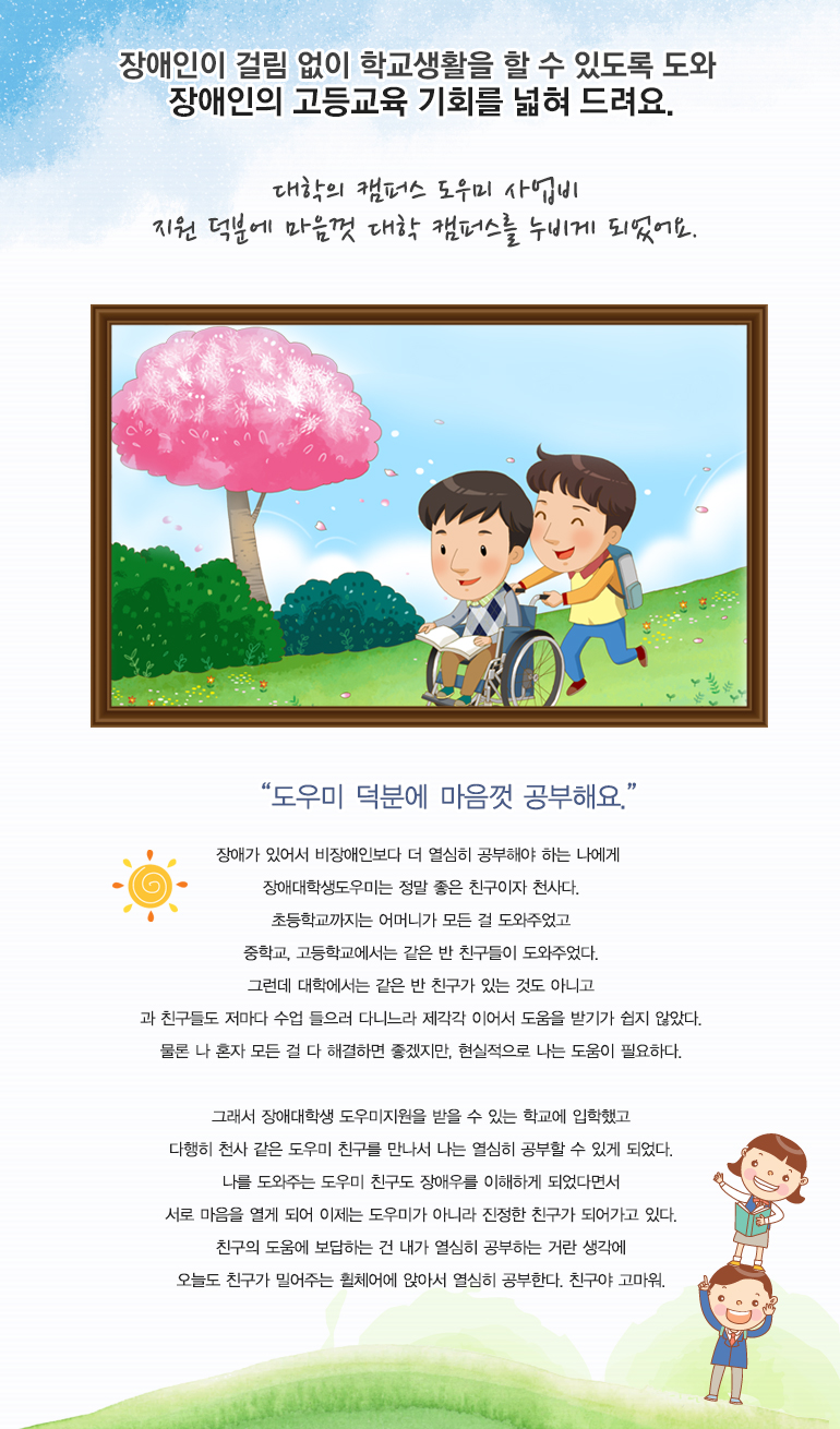 - 대학교에 재학중인 장애등급 1~3급 학생을 지원합니다.