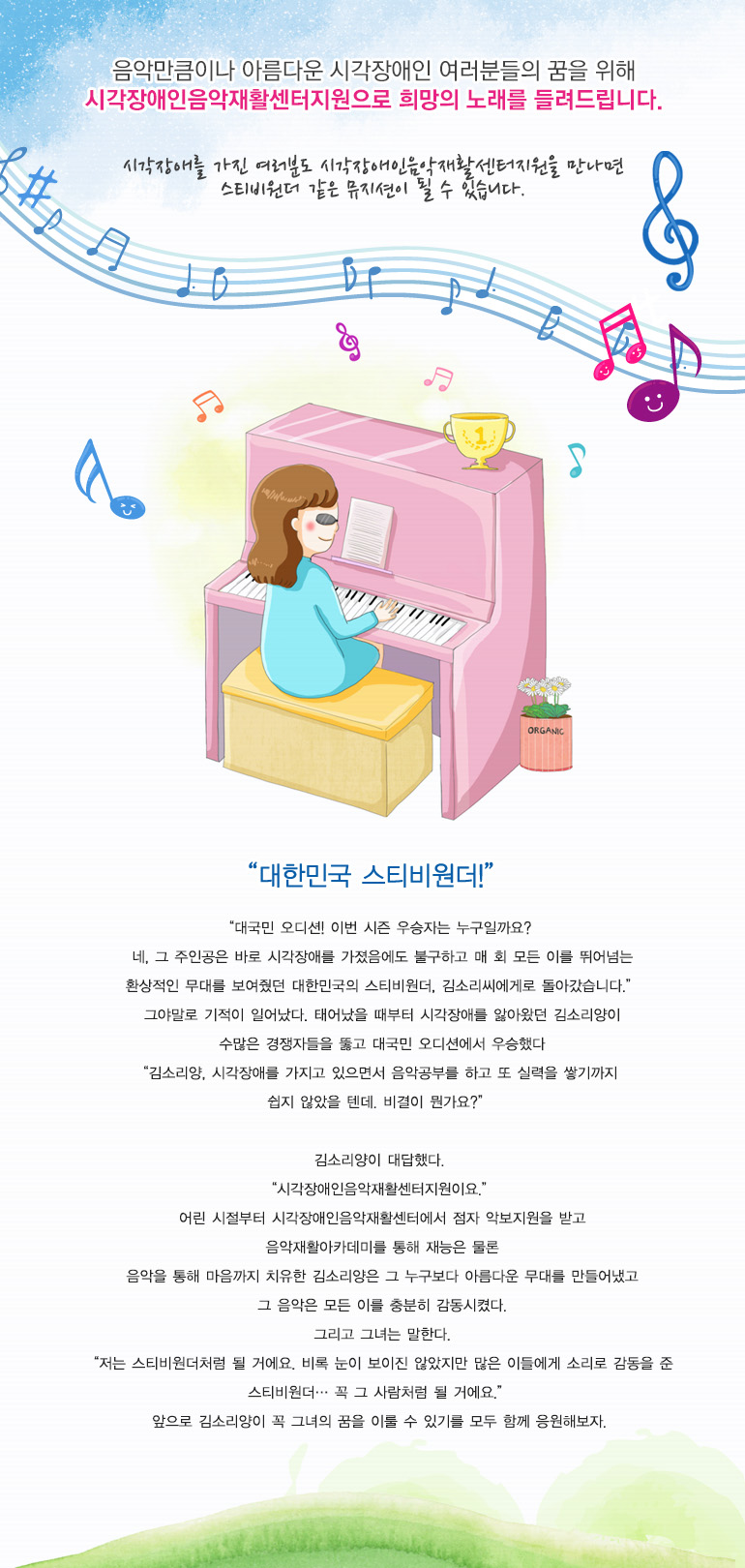 - 시각 장애인 음악재활 프로그램을 지원합니다.