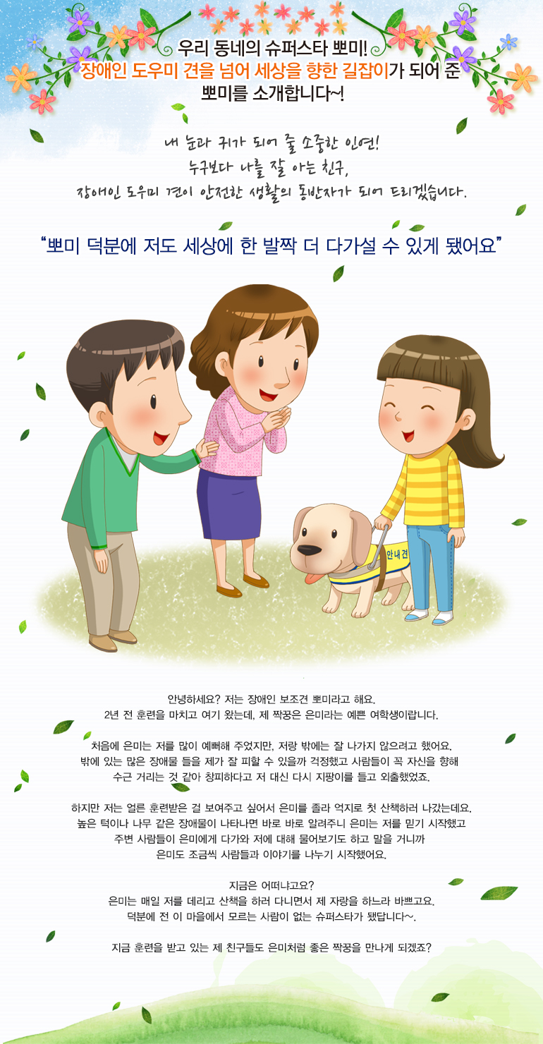 - 장애인 보조견의 훈련과 보급, 사후관리, 장애인 보조견에 대한 캠페인과 홍보를 지원합니다.