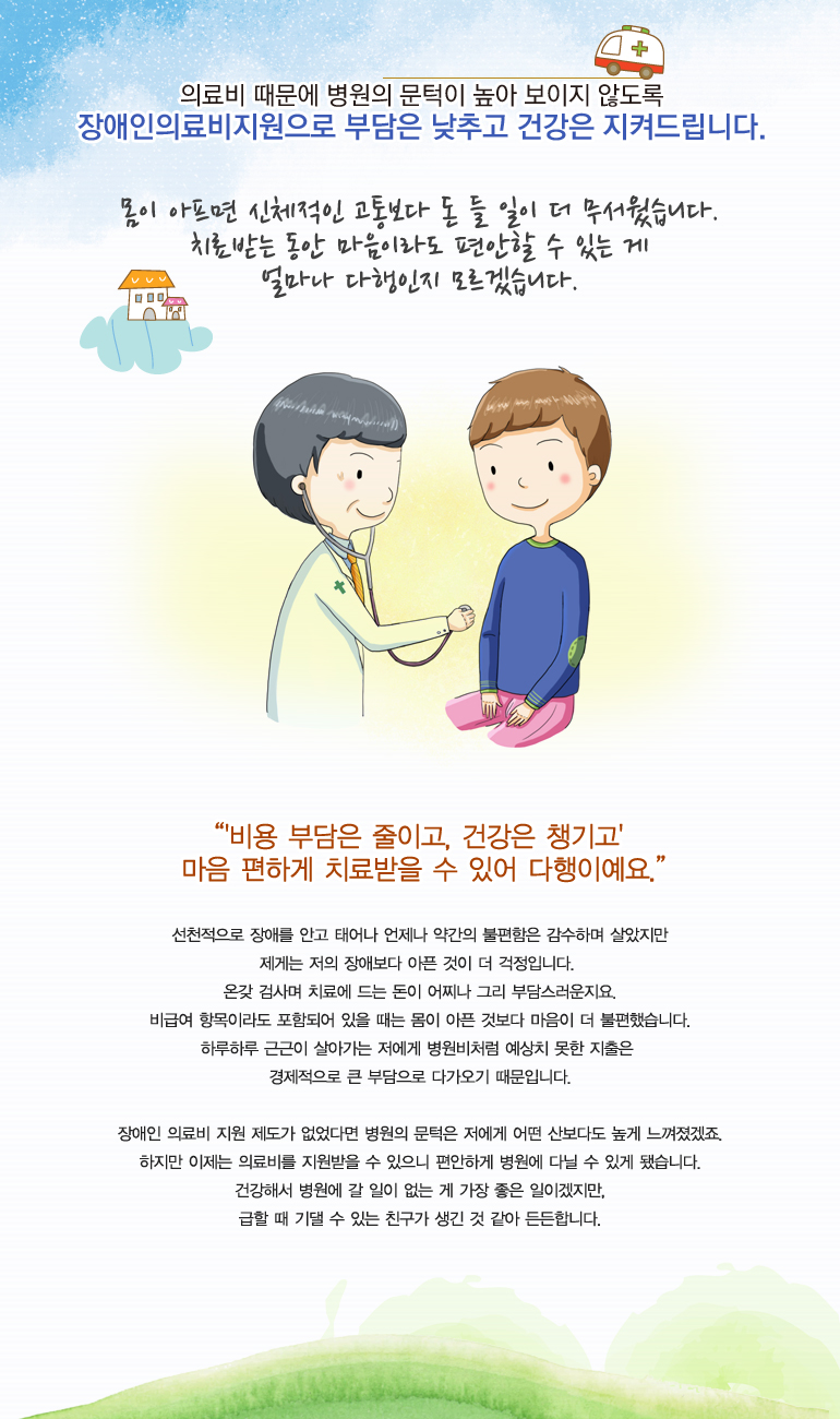 - 장애인 의료비는 장애인에게만 지원되고 장애인과 세대를 같이 하는 비장애인에게는 지원하지 않습니다.