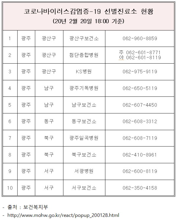 복지정보 코로나바이러스감염증-19 선별진료소 현황(2020년 2월 20일 기준) 게시글 작성정보 작성자 기획홍보팀 작성일 20-02-21 12:15 조회수 825 댓글수 0 검색목록 목록 게시글 본문 첨부파일 1개 선별진료소.png (27.5K) 0회 다운로드 첨부일시 : 2020-02-21 12:15:00 이전글 장애인 학대 신고 20-02-27 다음글 장애인 학대란? 20-02-20 댓글 0 등록된 댓글이 없습니다. 검색목록 목록