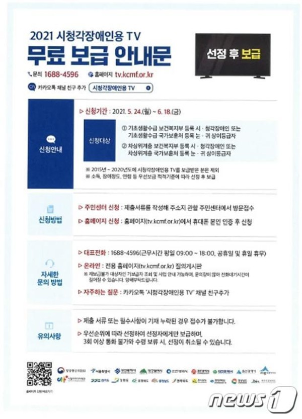 (서울=뉴스1) 박정양 기자 = 방송통신위원회는 시·청각장애인들이 방송서비스를 편리하게 이용할 수 있도록 '맞춤형TV' 무료보급 신청서를 24일부터 6월18일까지 접수한다고 23일 밝혔다.