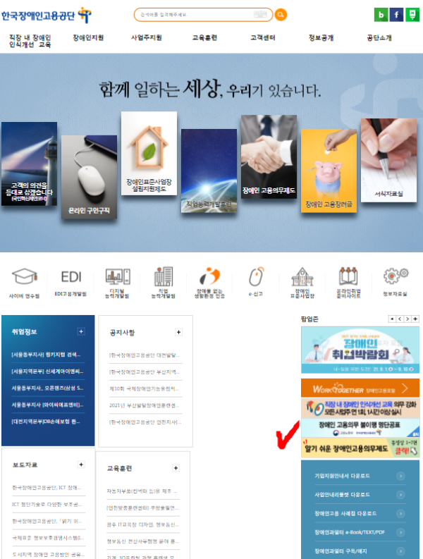 복지정보 알기 쉬운 장애인 고용의무제도 게시글 작성정보 작성자 기획홍보팀 작성일 21-08-25 17:49 조회수 1,179 댓글수 0 검색목록 목록 게시글 본문 한국장애인고용공단 홈페이지 (https://www.kead.or.kr/index.jsp)에 접속하면 메인 페이지에 '알기 쉬운 장애인고용의무제도'가 있습니다. 클릭하면 첨부파일 1개 20210825_174728.png (367.4K) 8회 다운로드 첨부일시 : 2021-08-25 17:49:00 이전글 복지 위기가구, 우리가 함께 찾고 함께 도와요 21-08-26 다음글 발달장애인 부모를 위한 아주 특별한 진로교육 진행 21-08-23 댓글 0 등록된 댓글이 없습니다. 검색목록 목록