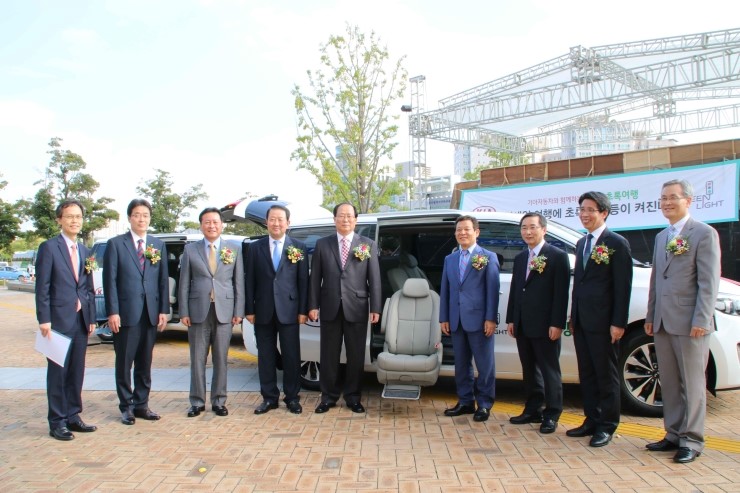 왼쪽부터 최창묵 기아자동차 CSR 경영팀장, 이재영 기아자동차 광주지역본부장, 조영표 광주시의회 의장, 박주선 새정치민주연합 국회의원, 김종웅 기아자동차 부사장, 윤장현 광주 시장, 임영율 광주 동구 부구청장, 백종환 에이블 복지재단 상임이사, 장세종 광주 동구 장애인복지관장이 카니발 이지무브 차량 앞에서 기념 촬영을 하는 모습