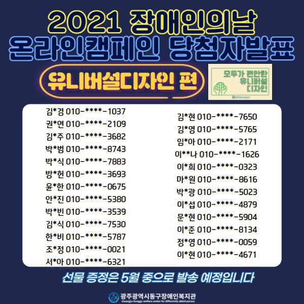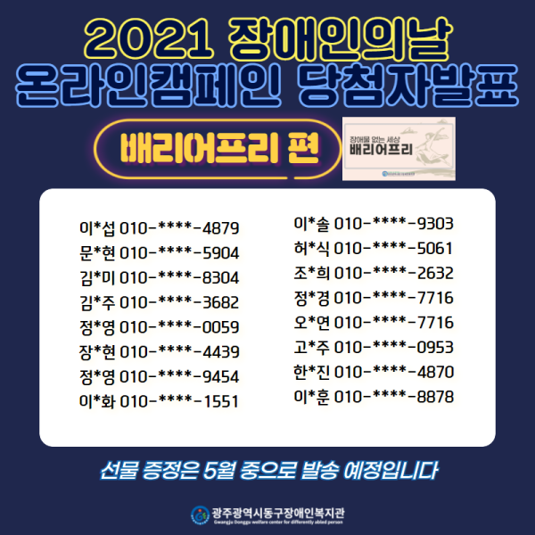 장애인의날 장애인식개선 온라인 캠페인 이벤트 당첨자 발표 게시글 작성정보 작성자 기획홍보팀 작성일 21-05-06 15:42 조회수 1,684 댓글수 0 목록 게시글 본문 [이벤트 당첨자발표] 장애인식개선 온라인캠페인 이벤트 당첨자를 발표합니다!!!! 선물은 5월 중으로 발송 될 예정입니다. 참여해주신 모든 분들께 감사드리며, 앞으로도 광주동구장애인복지관의 활동에 많은 관심부탁드립니다. 첨부파일 2개 2021온라인캠페인(배리어프리)당첨자발표.png (166.0K) 3회 다운로드 첨부일시 : 2021-05-06 15:42:00 2021온라인캠페인(유니버설) 당첨자발표.png (209.9K) 3회 다운로드 첨부일시 : 2021-05-06 15:42:00 이전글 2020년 사회복지시설 평가 "최우수 A등급"선정 21-05-13 다음글 배리어 프리[제 41회 장애인의 날 행사 6편] 21-04-23 댓글 0 등록된 댓글이 없습니다. 목록