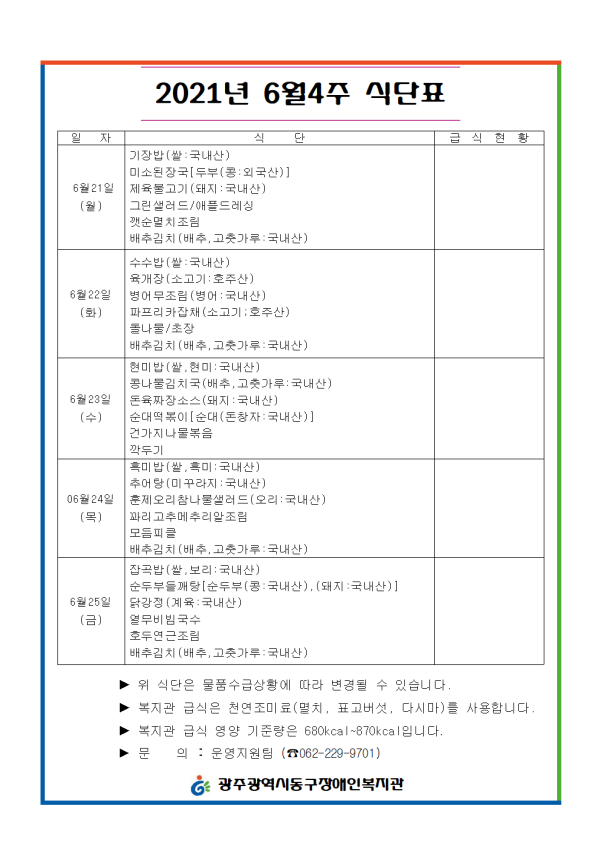 2021년 6월 4주 식단표 게시글 작성정보 작성자 류현진 작성일 21-06-21 08:11 조회수 1,636 댓글수 0 목록 게시글 본문 첨부파일 2개 06.21~06.25..png (40.3K) 3회 다운로드 첨부일시 : 2021-06-21 08:11:00 06.21~06001.png (661.3K) 3회 다운로드 첨부일시 : 2021-06-21 08:11:00 이전글 2021년 6월 5주 식단표 21-06-28 다음글 2021년 6월 3주 식단표 21-06-15 댓글 0 등록된 댓글이 없습니다. 목록