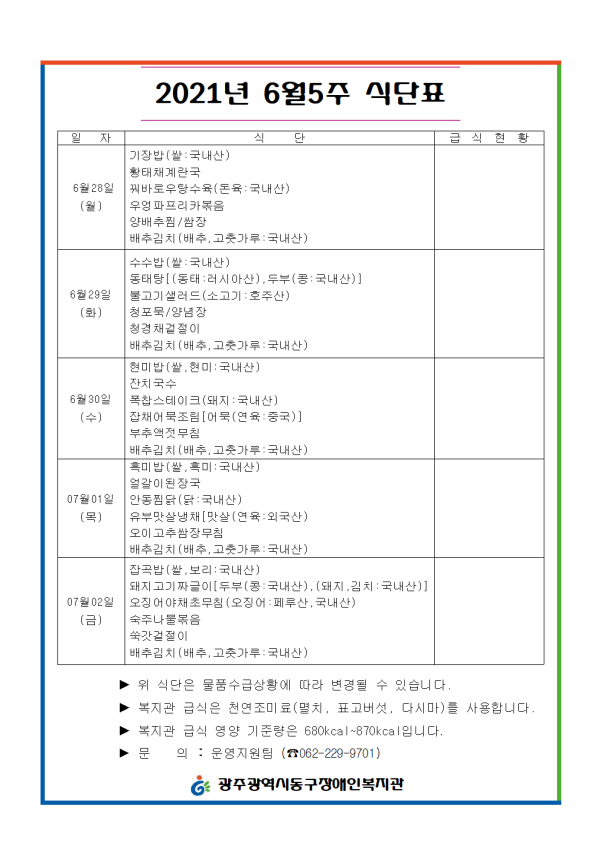 2021년 6월 5주 식단표 게시글 작성정보 작성자 류현진 작성일 21-06-28 07:47 조회수 1,635 댓글수 0 목록 게시글 본문 첨부파일 1개 06.28.~07001.png (40.7K) 3회 다운로드 첨부일시 : 2021-06-28 07:47:00 이전글 2021년 1차 테마여행 잘 다녀왔습니다. 21-06-28 다음글 2021년 6월 4주 식단표 21-06-21 댓글 0 등록된 댓글이 없습니다. 목록