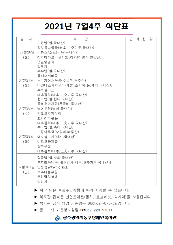 2021년 7월4주 식단표 게시글 작성정보 작성자 류현진 작성일 21-07-26 08:00 조회수 1,600 댓글수 0 목록 게시글 본문 첨부파일 3개 7.26.~7001.png (39.6K) 4회 다운로드 첨부일시 : 2021-07-26 08:00:00 7.26.~7001.png (39.9K) 4회 다운로드 첨부일시 : 2021-07-26 08:00:00 7.26.~7001.png (344.1K) 4회 다운로드 첨부일시 : 2021-07-26 08:00:00 이전글 우쿨렐레 참여자모집 21-07-26 다음글 장애인에 대한 사회인식 개선 영상 공모전 안내 21-07-22 댓글 0 등록된 댓글이 없습니다. 목록