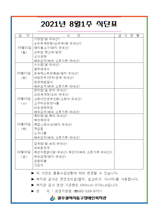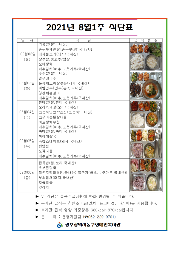 2021년 8월1주 식단표 게시글 작성정보 작성자 류현진 작성일 21-07-30 13:50 조회수 1,629 댓글수 0 목록 게시글 본문 첨부파일 2개 8.2.~8001.png (39.1K) 6회 다운로드 첨부일시 : 2021-07-30 13:50:00 8.2.~8001.png (347.5K) 6회 다운로드 첨부일시 : 2021-07-30 13:50:00 이전글 "말복 기념 이벤트!" 참여 하세요 21-08-05 다음글 광주동구장애인복지관, 랜선으로 기관 견학 하기 21-07-28 댓글 0 등록된 댓글이 없습니다. 목록