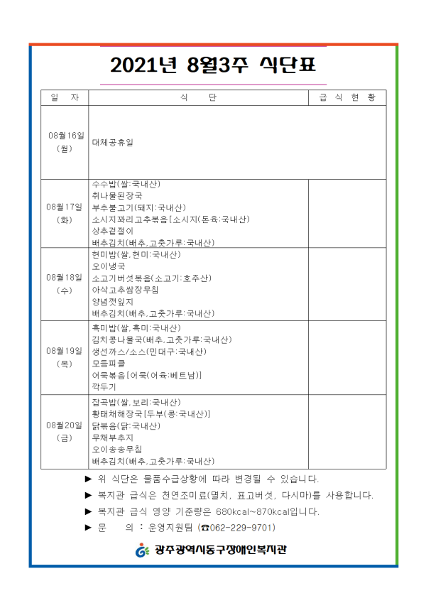2021년 8월3주 식단표 게시글 작성정보 작성자 류현진 작성일 21-08-13 14:58 조회수 1,692 댓글수 0 목록 게시글 본문 첨부파일 3개 8.16.~8.20.001.png (37.3K) 5회 다운로드 첨부일시 : 2021-08-13 14:58:00 8.16.~8.20001.gif (38.8K) 5회 다운로드 첨부일시 : 2021-08-13 14:58:00 8.16.~8.20001.png (284.8K) 5회 다운로드 첨부일시 : 2021-08-13 14:58:00 이전글 2021년 8월4주 식단표 21-08-20 다음글 생활인문학수강생 모집 21-08-11 댓글 0 등록된 댓글이 없습니다. 목록