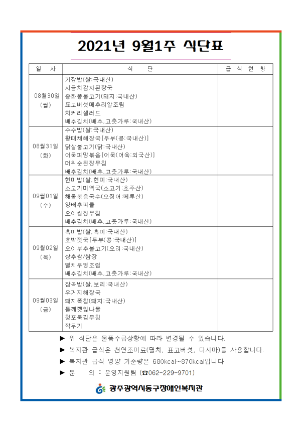 2021년 9월1주 식단표 게시글 작성정보 작성자 류현진 작성일 21-08-27 17:12 조회수 1,710 댓글수 0 목록 게시글 본문 첨부파일 1개 8.30.~9001.png (39.3K) 5회 다운로드 첨부일시 : 2021-08-27 17:12:00 이전글 송편 만들기 꾸러미 체험자 모집 21-09-02 다음글 2021년 8월4주 식단표 21-08-20 댓글 0 등록된 댓글이 없습니다. 목록