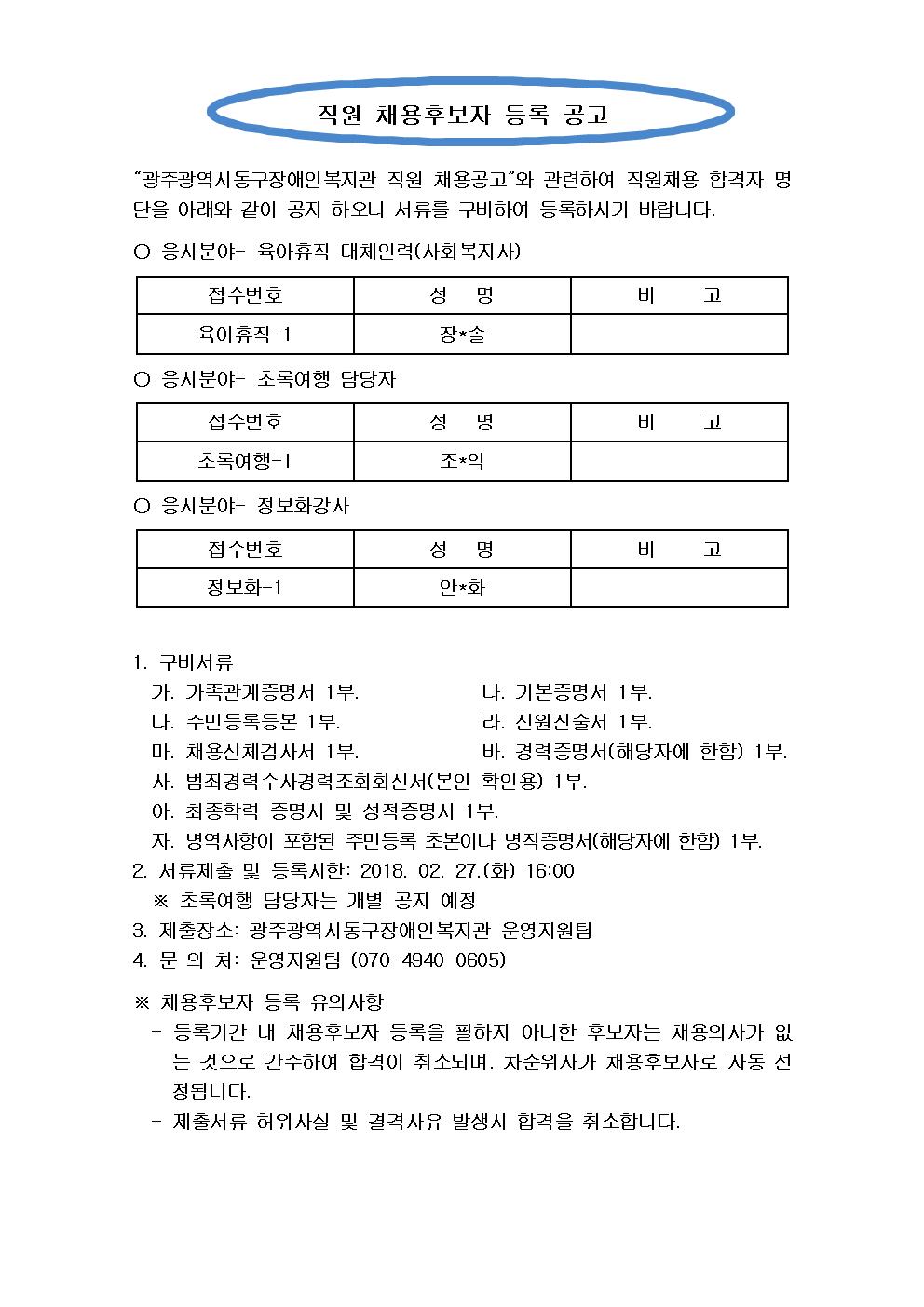 광주광역시동구장애인복지관 직원 채용공고와 관련하여 직원채용 합격자 명단을 아래와 같이 공지하오니 서류를 구비하여 등록하시기 바랍니다.