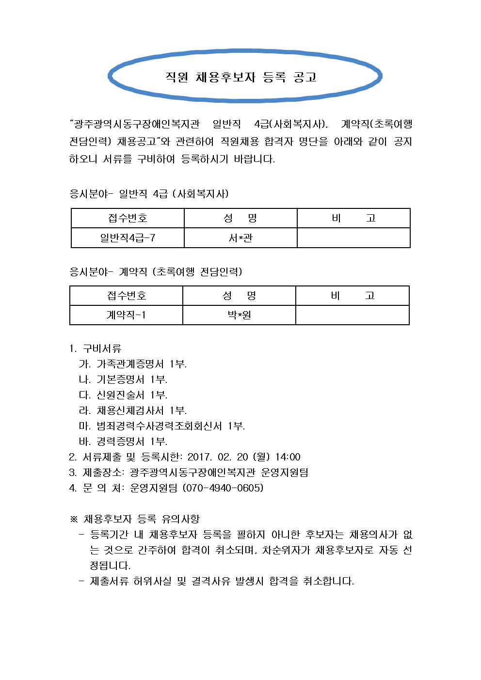 ‘광주광역시동구장애인복지관 일반직 4급(사회복지사), 계약직(초록여행 전담인력) 채용공고’와 관련하여 직원채용 합격자 명단을 아래와 같이 공지하오니, 서류를 구비하여 등록하시기 바랍니다.