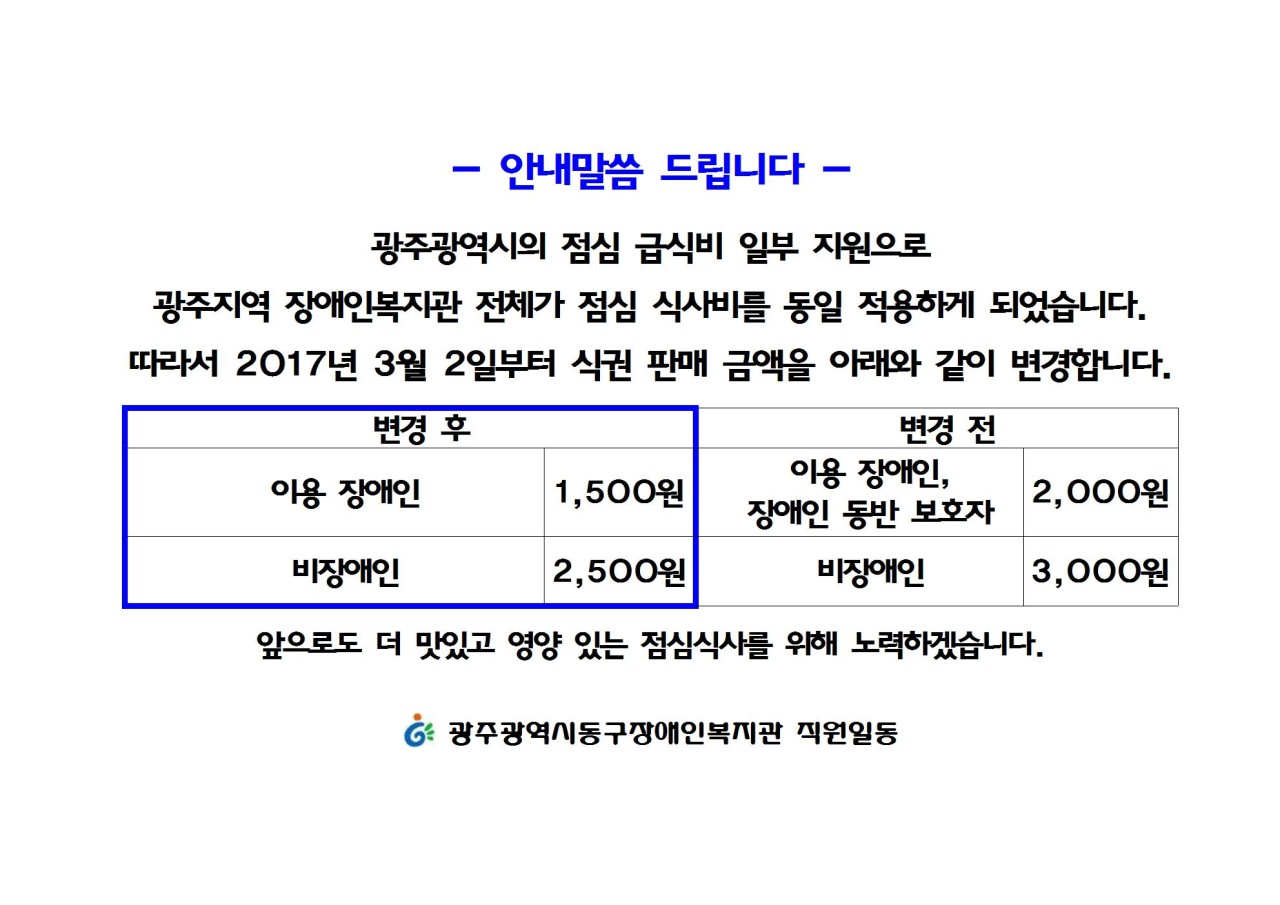 비장애인의 식사비는 기존 3,000원에서 2,500원으로 각각 인하됩니다.