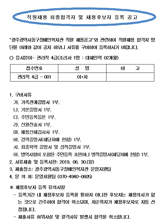 광주광역시동구장애인복지관 직원 채용공고와 관련하여 직원채용 합격자 명단을 아래와 같이 공지하오니 서류를 구비하여 등록하시기 바랍니다.