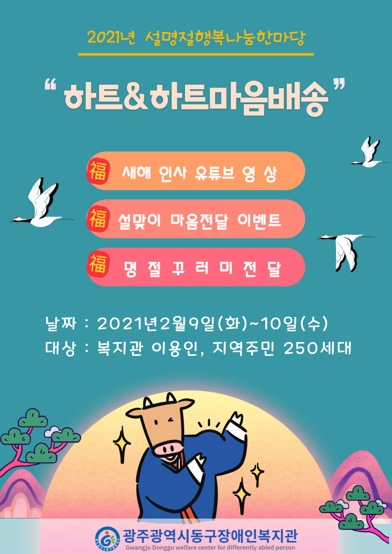 2021년 설 명절 행복나눔한마당 안내 게시글 작성정보 작성자 한상원 작성일 21-01-28 18:33 조회수 1,359 댓글수 0 목록 게시글 본문 첨부파일 1개 [크기변환]홈페이지 팜업 (4).png (1.7M) 2회 다운로드 첨부일시 : 2021-01-28 18:33:00 이전글 설명절행복나눔이벤트 "하트&하트 마음배송" 안내 21-01-28 다음글 난타교실 참여자 모집 21-01-28 댓글 0 등록된 댓글이 없습니다. 목록