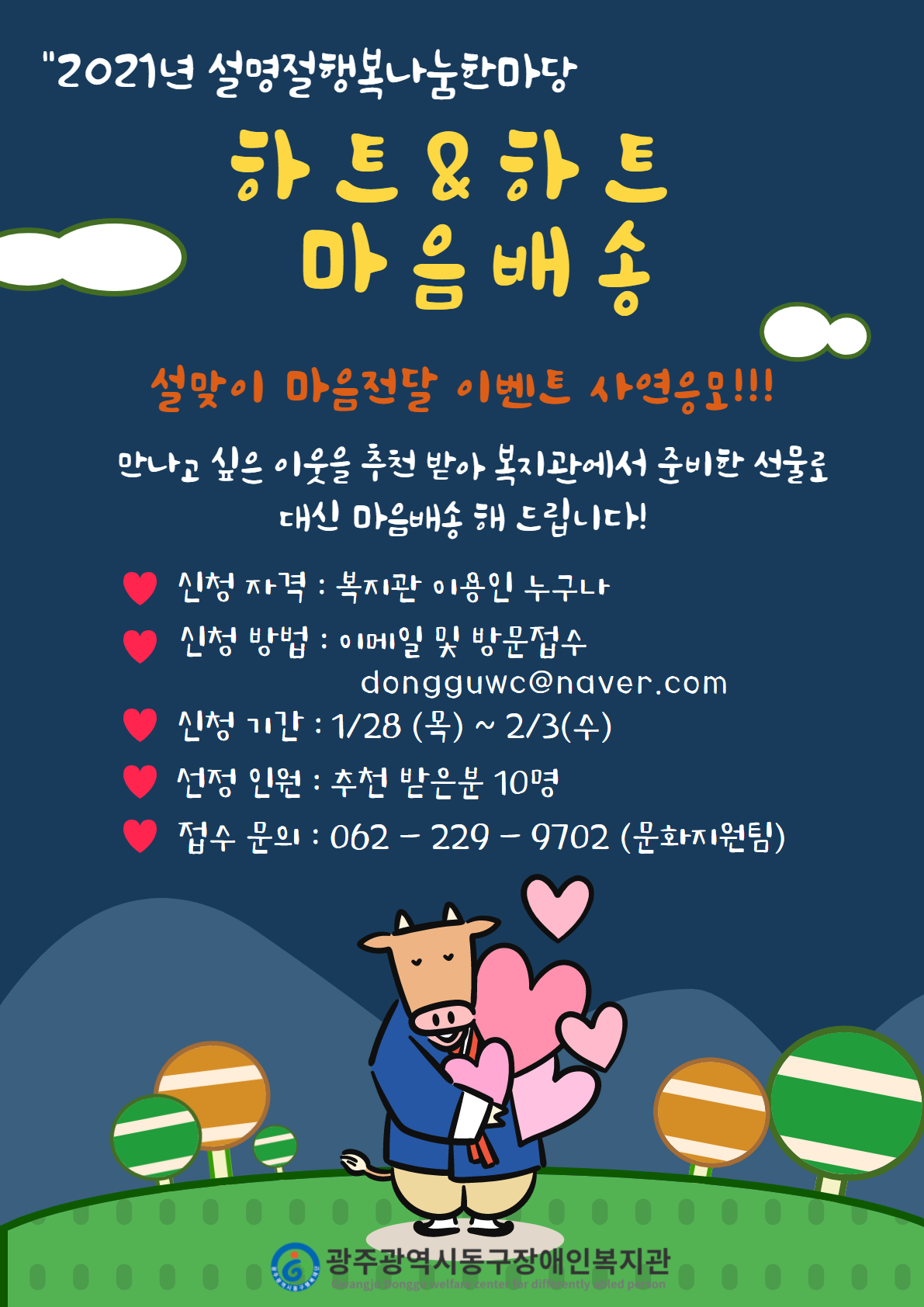설명절행복나눔이벤트 "하트&하트 마음배송" 안내 게시글 작성정보 작성자 한상원 작성일 21-01-28 18:36 조회수 1,447 댓글수 0 목록 게시글 본문 첨부파일 2개 [크기변환]이벤트 포스터 (8).png (229.9K) 2회 다운로드 첨부일시 : 2021-01-28 18:36:00 이벤트_신청서.hwp (16.0K) 93회 다운로드 첨부일시 : 2021-01-28 18:36:00 이전글 직원채용공고 21-02-04 다음글 2021년 설 명절 행복나눔한마당 안내 21-01-28 댓글 0 등록된 댓글이 없습니다. 목록