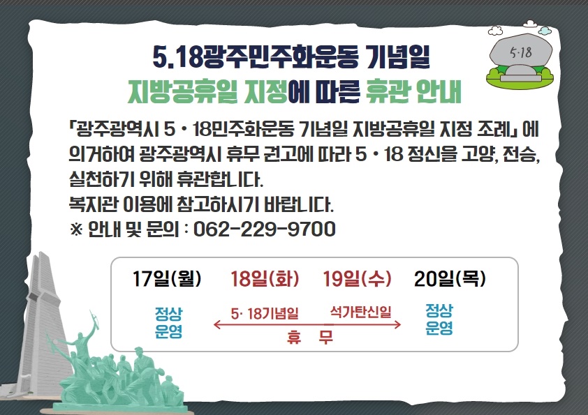 '5.18 민주화운동 지방공휴일 지정'에 의거한 복지관 휴관 안내