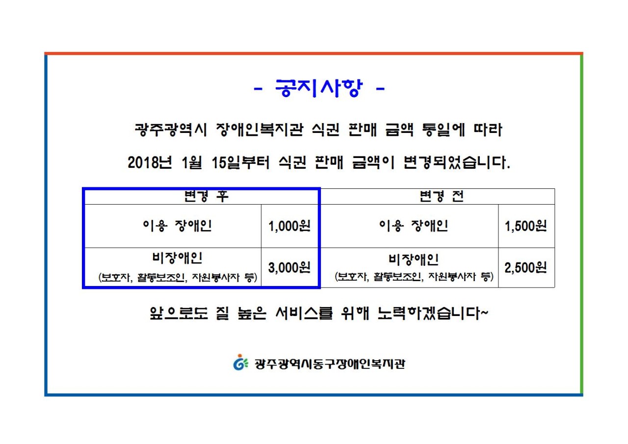 광주광역시 장애인복지관 식권 판매 금액 통일에 따라 2018년 1월 15일부터 식권 판매 금액이 변경되었습니다.